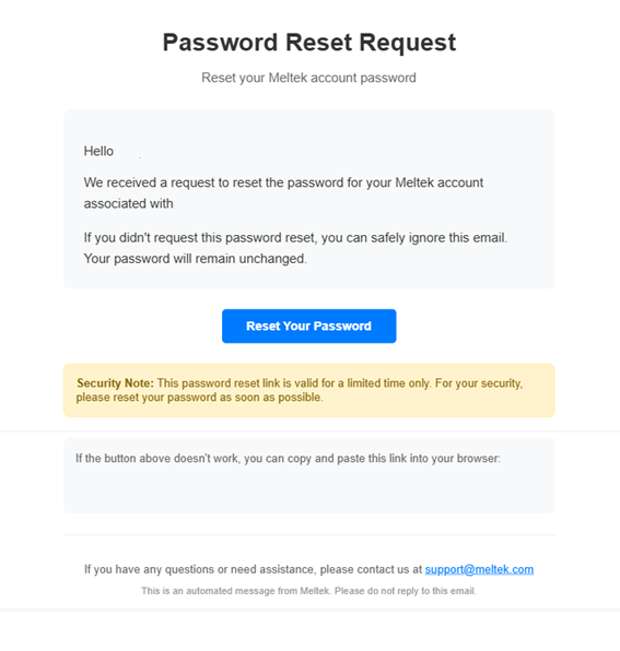 You'll receive an email with a password reset link. The email will look similar to the example shown below: